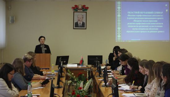 15 и 16 октября на базе Гомельского областного института развития в рамках реализации республиканского инновационного проекта "Внедрение модели управления развитием профессиональной компетентности специалистов организаций, осуществляющих научно-методическое обеспечение образовательного процесса на районном уровне" состоялся семинар по теме "Введение в профессиональную деятельность", в котором приняли участие 28 вновь назначенных специалистов учебно-методических кабинетов Гомельской, Могилевской и Гродненской областей.
