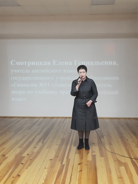 Напутствуя участников на открытии конкурса, Смотрицкая Е.Г., председатель жюри по английскому языку, пожелала самым трудолюбивым победы и процитировала слова генерала, выигравшего много сражений: Вам необходимо много тренироваться, чтобы во время сражения стать победителем.